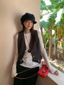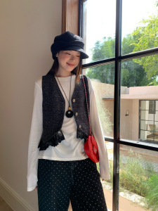 诠释美 NEWOPEN 25秋法式气质蕾丝花边叠穿小香风v领马甲女F6523