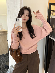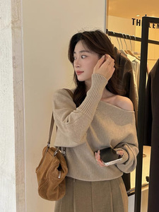 卡其色心机纯欲风一字肩露肩针织衫女早秋高级感慵懒毛衣内搭上衣