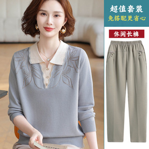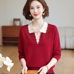 妈妈秋装2025新款气质翻领薄款毛衣中老年女装针织上衣长袖打底衫