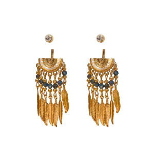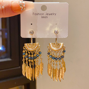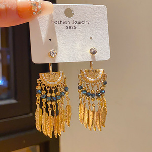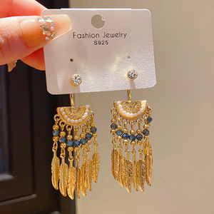 银针复古轻奢镶钻仿珍珠树叶流苏耳环小众高级感宫廷风气质耳饰女