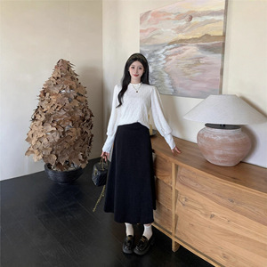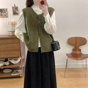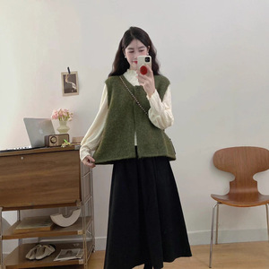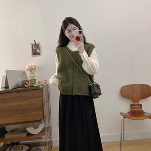 大码法式遮肉显瘦三件套装女秋季针织马甲背心蕾丝打底衫半身裙