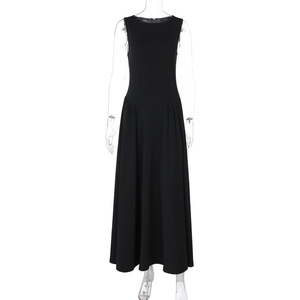 欧美外贸女装2025秋季新款纯色圆领无袖褶皱大摆裙时尚气质连衣裙
