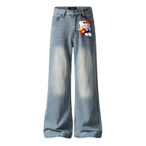 Fudge Pink 2025秋季New甜美少女公仔装饰宽松水洗牛仔长裤