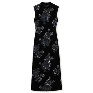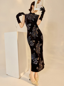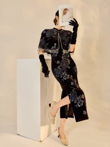 黑色国风新中式秋季刺绣旗袍改良年轻款高级感流苏披肩套装 N8056