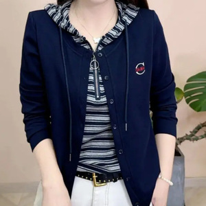 秋季新款条纹拼接假两件连帽长袖卫衣2025洋气妈妈装显瘦减龄上衣