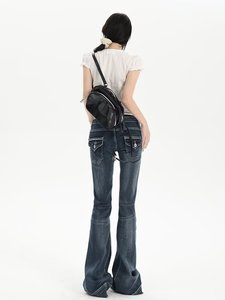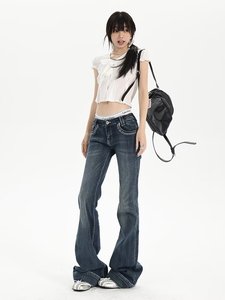 复古蓝高腰水洗猫须微喇牛仔裤女早秋辣妹修身显瘦弹力百搭马蹄裤