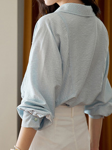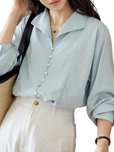 蓝绿色条纹翻领长袖衬衫女秋季2025新款法式复古气质通勤v领上衣