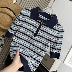 木巨2600+!复古撞色条纹透气冰丝半拉链POLO领针织衫短袖T恤女夏