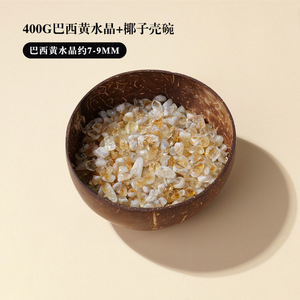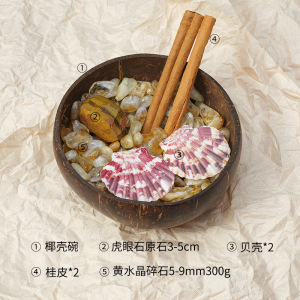 土土碗=椰子壳碗+300g黄水晶5-9mm碎石+3-5cm虎眼石原石+肉桂+贝壳