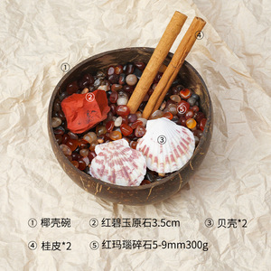 火火碗=椰子壳碗+300g红玛瑙5-9mm碎石+3-5cm红碧玉原石+肉桂+贝壳