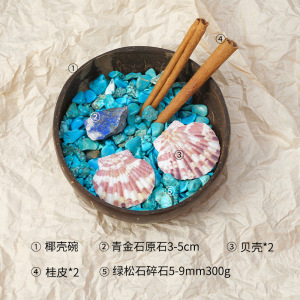 水水晶碗=椰子壳碗+300g绿松5-9mm碎石+3-5cm青金石原石+肉桂+贝壳