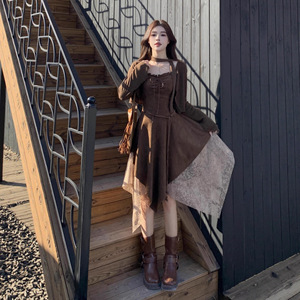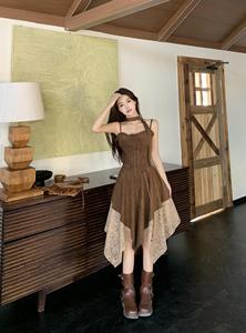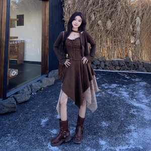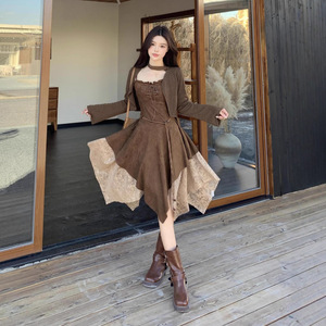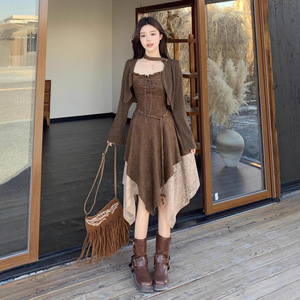 早秋新款韩版别致设计感辣妹拼接洋气收腰吊带连衣裙女披肩套装潮