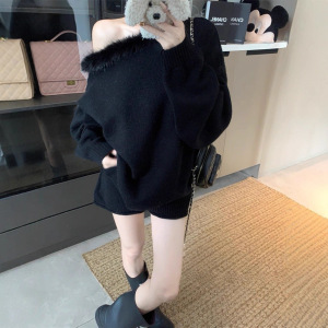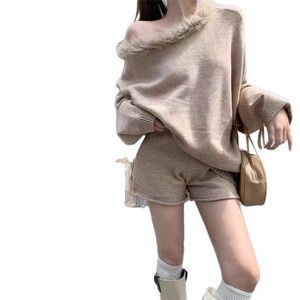 跨境欧美新款领斜肩一字肩毛衣女宽松慵懒风针织衫短裤显瘦两件套
