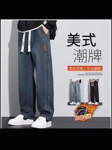 秋冬加绒青少年牛仔裤男阔腿直筒牛仔裤复古新款美式宽松男士裤子