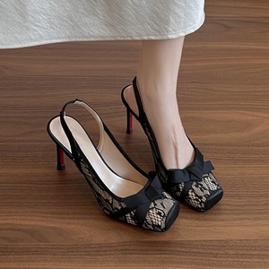CL同款后空浅口蝴蝶结红底单鞋2025新款蕾丝网纱方头高跟鞋女细跟