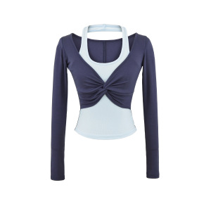 设计感假两件拼色长袖T恤女2025秋季款美式辣妹扭结修身显瘦上衣