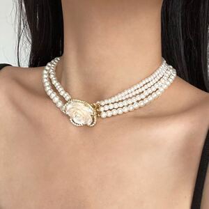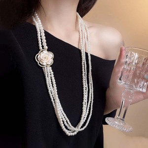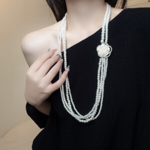 法式长款多层叠戴立体山茶花朵珍珠项链女轻奢高级感锁骨链毛衣链
