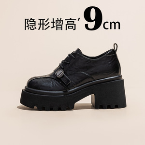网红爆款厚底增高乐福鞋黑色英伦风小个子可爱百搭系带小皮鞋单鞋