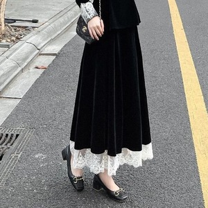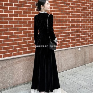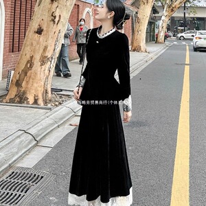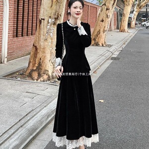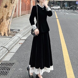 黑色丝绒连衣裙套装女2025秋季新款收腰上衣蕾丝拼接半身裙两件套