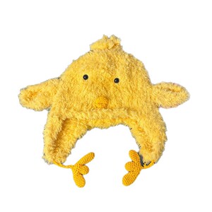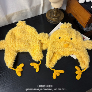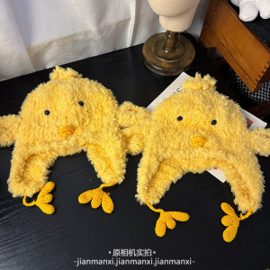 亲子可爱毛绒绒黄色萌鸡护耳帽子女款秋冬新款保暖套头甜美毛线帽