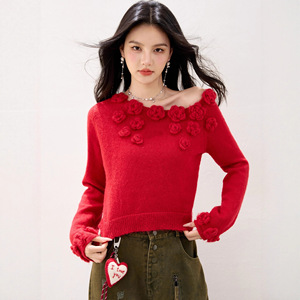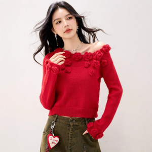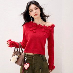 斜肩露肩立体玫瑰花长袖针织衫女2025秋冬新款设计感小众气质上衣