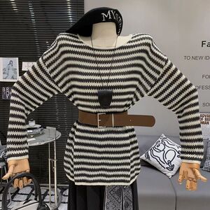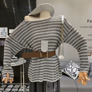 韩版复古慵懒风条纹圆领系带收腰设计感百搭宽松减龄针织上衣女