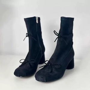 现货~圆头小众设计法式芭蕾风增高蝴蝶结瘦瘦靴女粗跟侧拉链短靴