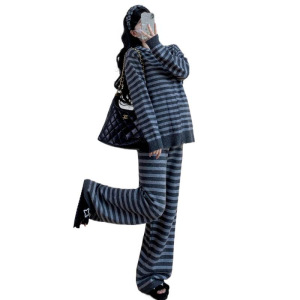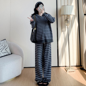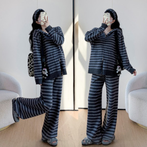 孕妇新款秋冬装条纹连帽针织拉链开衫毛衣外套阔腿裤宽松休闲套装