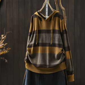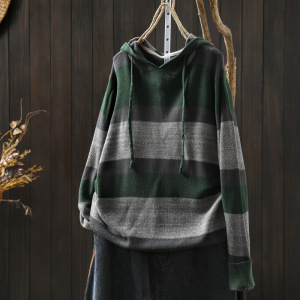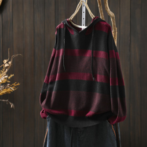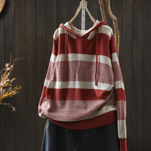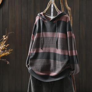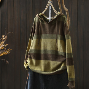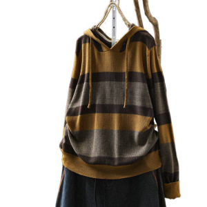 条纹连帽针织衫女2025新款秋季休闲撞色宽松时尚长袖套头针织上衣