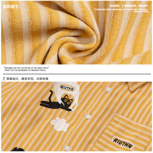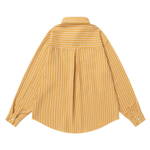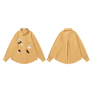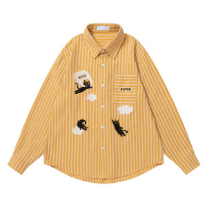 美式复古条纹黄色衬衫男女夏秋季刺绣飞天小猫设计感宽松长袖衬衣