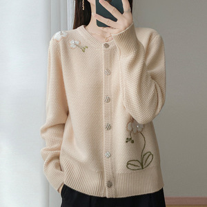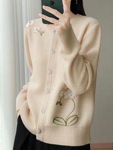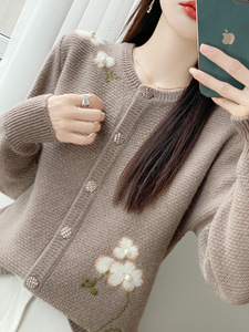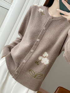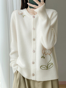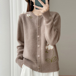 2025秋冬款100%羊毛开衫女圆领单排扣针织衫绣花上衣全羊毛百搭