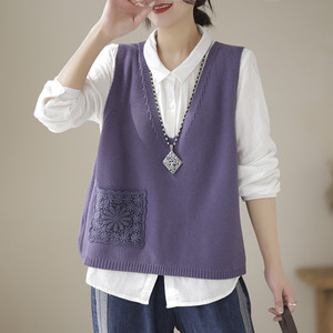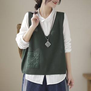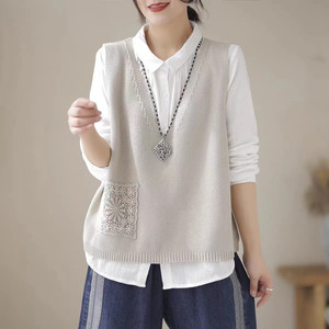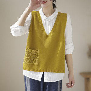 秋装色纺纱针织马甲韩系简约蕾丝口袋背心女套头休闲百搭叠穿坎肩