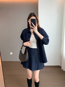 泽黛佳伊 休闲少女 柔软有筋骨感宽松翻领长袖牛仔衬衫百褶短裙套