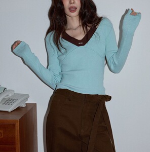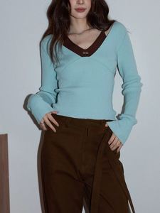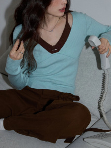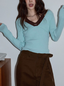吵吵 韩系薄荷色V领短款针织衫女2025秋气质收腰修身长袖上衣