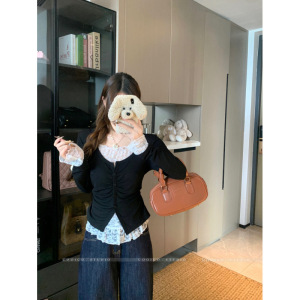 胖mm2025秋季新款宽松显瘦遮肉蕾丝拼接上衣假两件正肩长袖