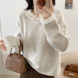 蕾丝拼接连帽长袖针织衫女2025新款秋装纯欲设计感别致宽松毛衣潮