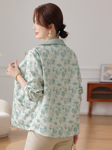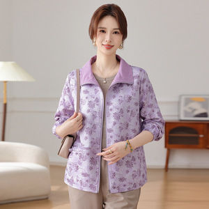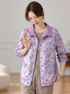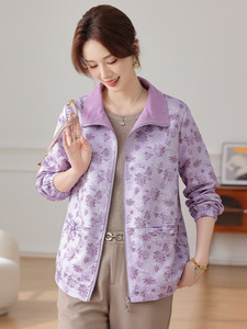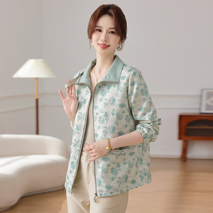 妈妈洋气印花短裤外套中年女装春秋装中老年翻领大码拉链薄款上衣