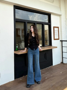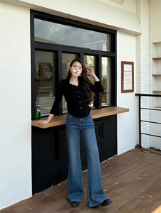 秋上新【四面弹】筒喇裤秋季牛仔裤女中高腰蓝色宽松显瘦复古休闲