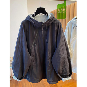 牛X货 巨炸裂!高端斜拉链冲锋衣外套女秋韩版宽松连帽薄款两面穿