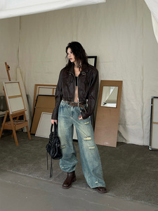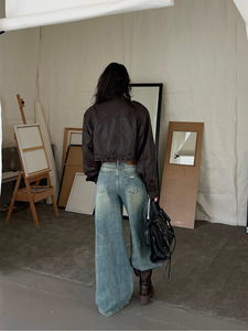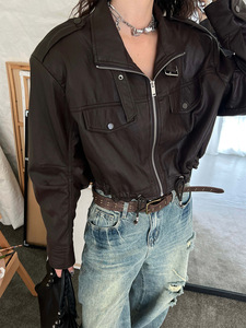 2025秋冬立领蝙蝠袖抽绳短款皮衣外套拉链口袋拼接时尚夹克83980