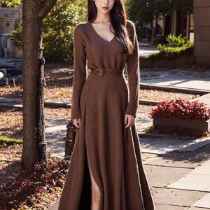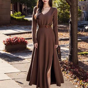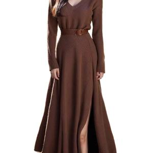 显瘦长款咖色毛衣连衣裙女秋冬2025新款小香风v领针织裙子