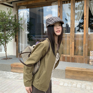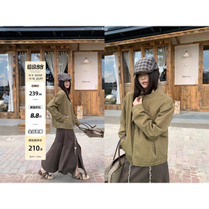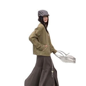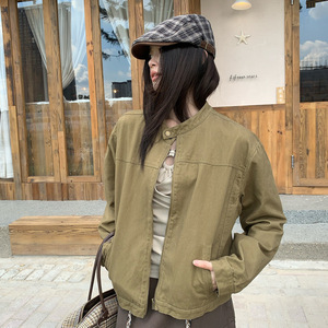 宋正恩复古卡绿色小立领开衫外套女秋季新款修身百搭拉链夹克上衣