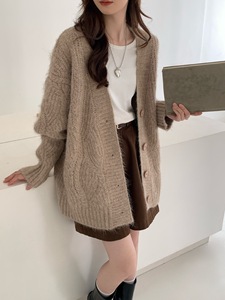 跨境V领厚中长款针织开衫上衣秋冬新款软糯保暖慵懒风毛衣女外套