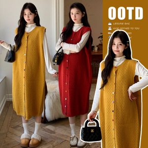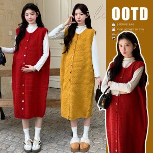 孕妇秋冬新款宽松中长款针织马甲连衣裙百搭打底衫甜美显瘦两件套
