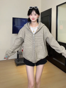 韩系条纹拉链开衫外套女2025新款秋季设计感小众宽松慵懒风卫衣潮