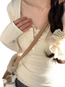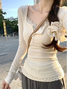 2025纯欲bm风蕾丝假两件长袖t恤女秋季法式感修身内搭甜辣妹上衣1