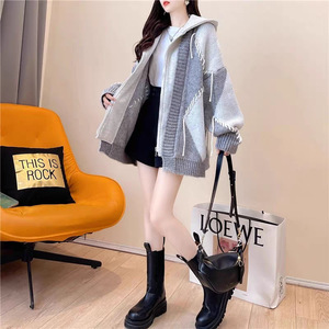 秋冬季连帽拉链拼接毛线菱格毛衣外套女休闲设计感针织开衫上衣