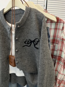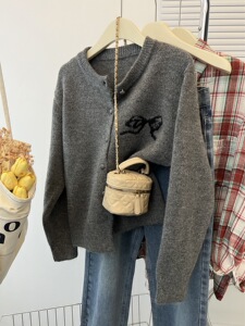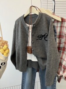 秋冬季新款韩版设计感上衣灰色复古羊毛针织毛衣女圆领开衫