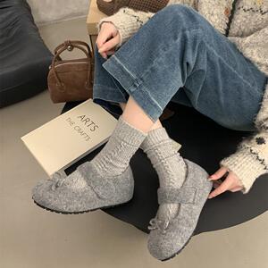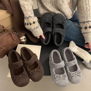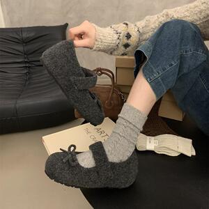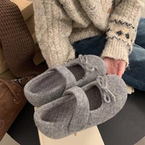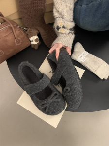 小香风蝴蝶结灰色毛呢内增高加绒勃肯鞋子女厚底玛丽珍浅口毛毛鞋