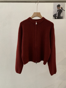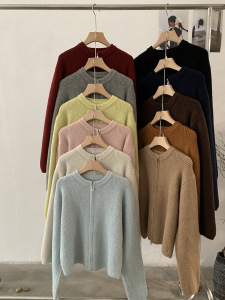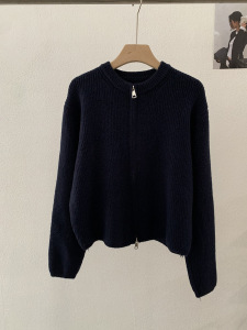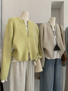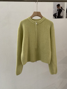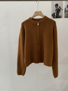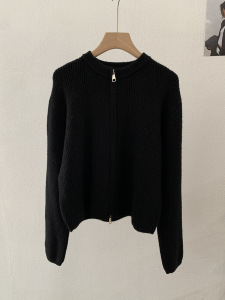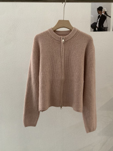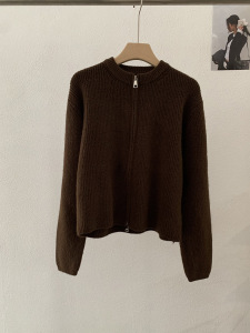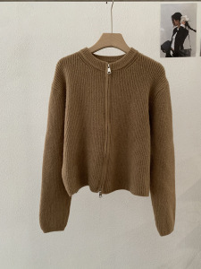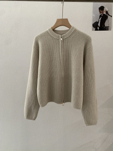 欧玛莱 韩版坑条圆领拉链针织开衫秋季外搭宽松显瘦毛衣外套 4785